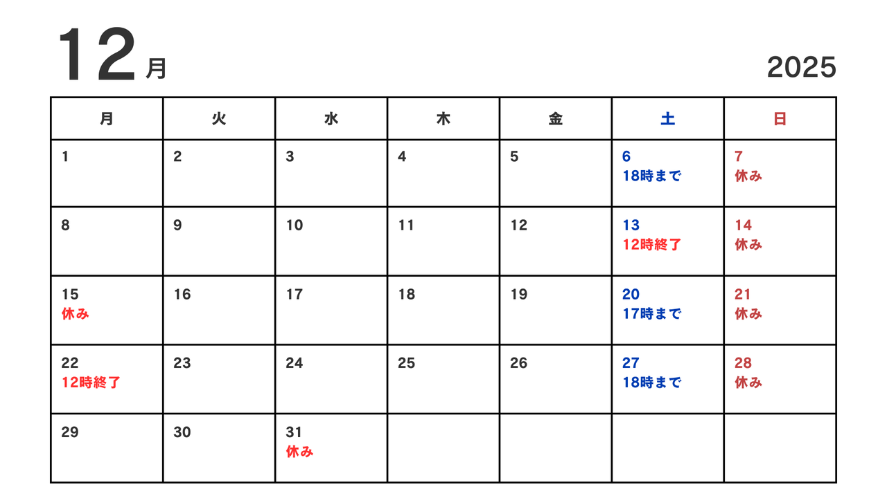 2025年12月の営業予定表 ※営業時間9時~19時。水曜・土曜は変則営業