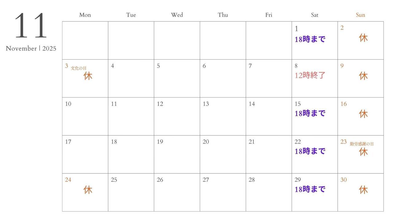 2025年11月の営業予定表 ※営業時間9時~19時。水曜・土曜は変則営業