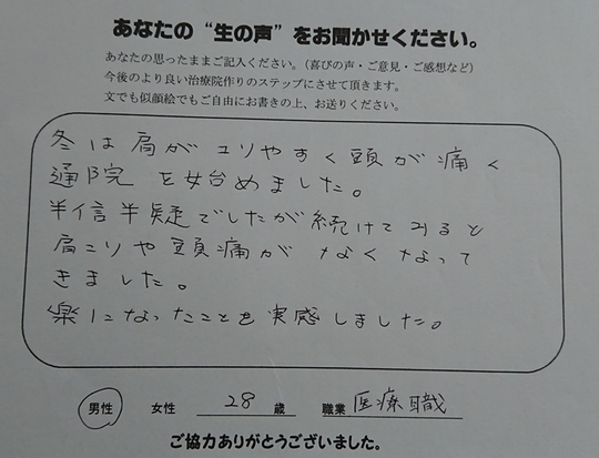 冬は肩がこりやすく頭が痛く、通院を始めました。