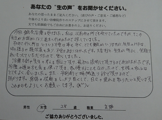 治療の進め方も気を使って頂き、我慢することもなかったので、女性の私には、とても良く合いました。